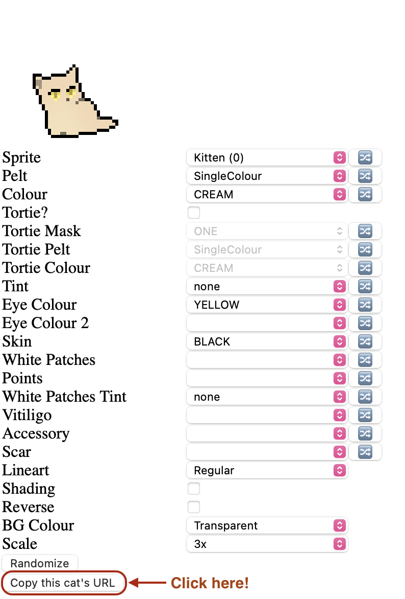 The cat maker URL in your address bar will also be updated whenever you change the appearance of the cat.